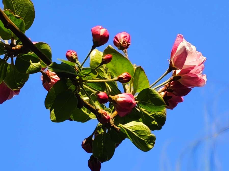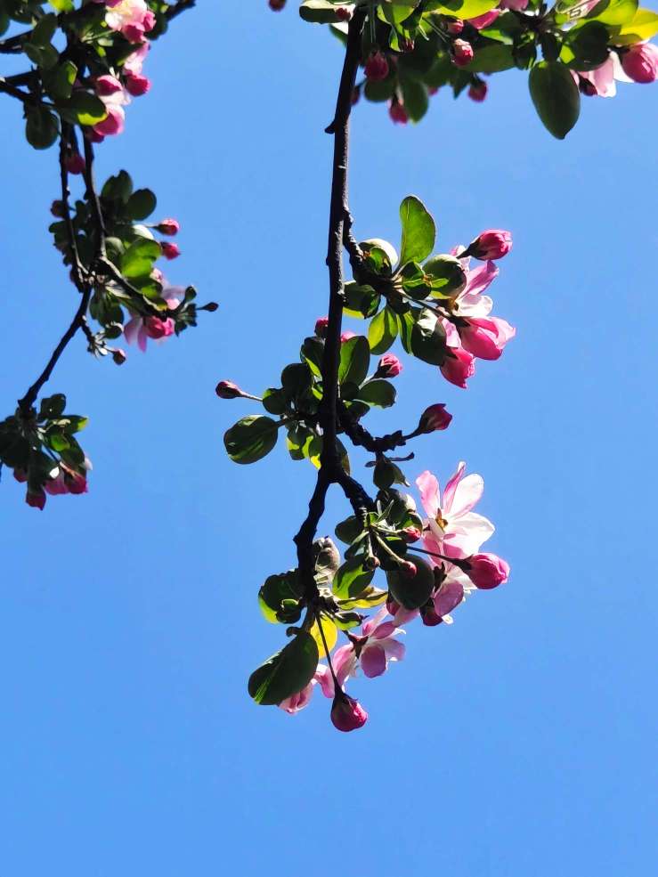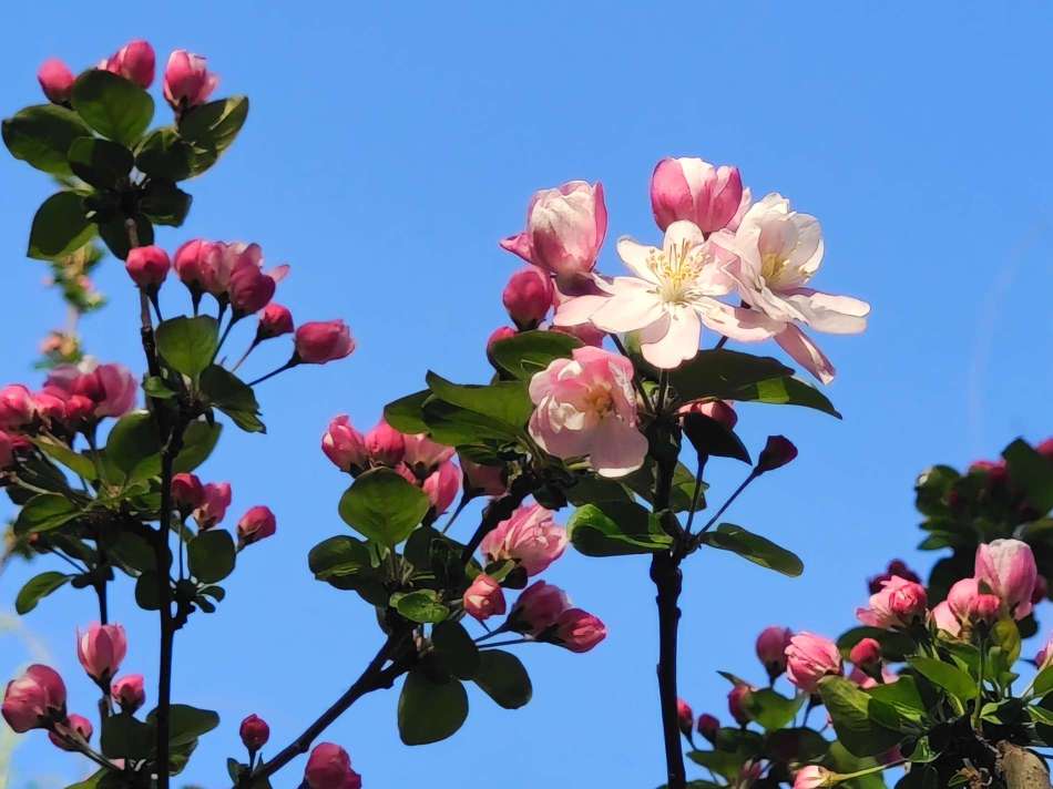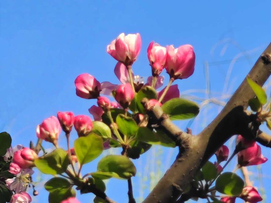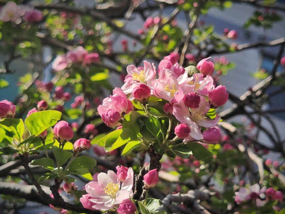 春风轻拂,西府海棠摇曳生姿,花瓣轻柔摆动,娇柔婀娜,姿态俏皮,明媚迷人,好似在向人们展现它的曼妙风姿。暖阳下绽放出艳丽的花朵,和嫩绿的叶片相互映照,满树的繁花似锦缎般绚烂,既绘就了一幅生机盎然、五彩斑斓的绝美画卷,又成为春天里一抹亮丽的景致。(高军摄影)