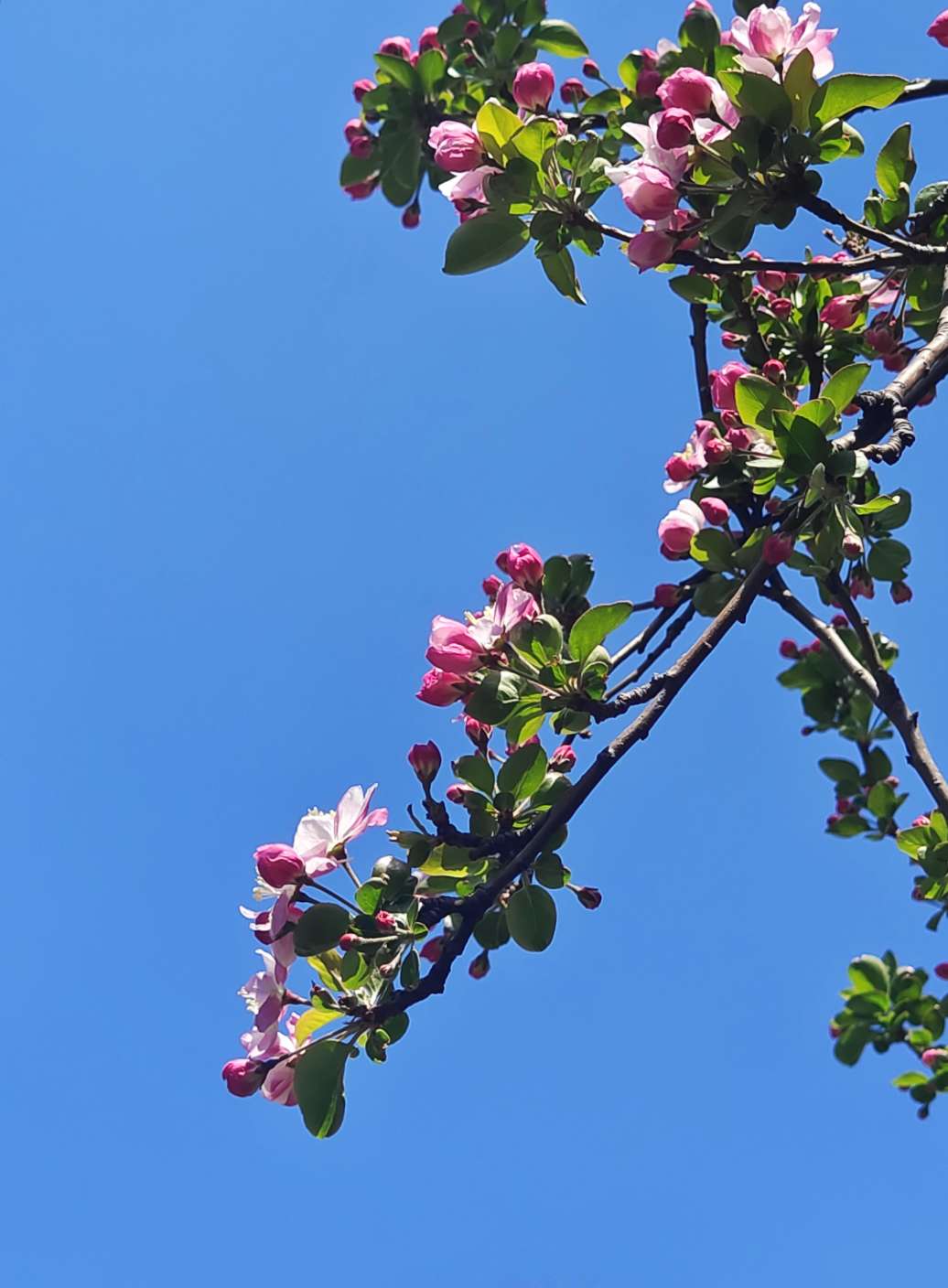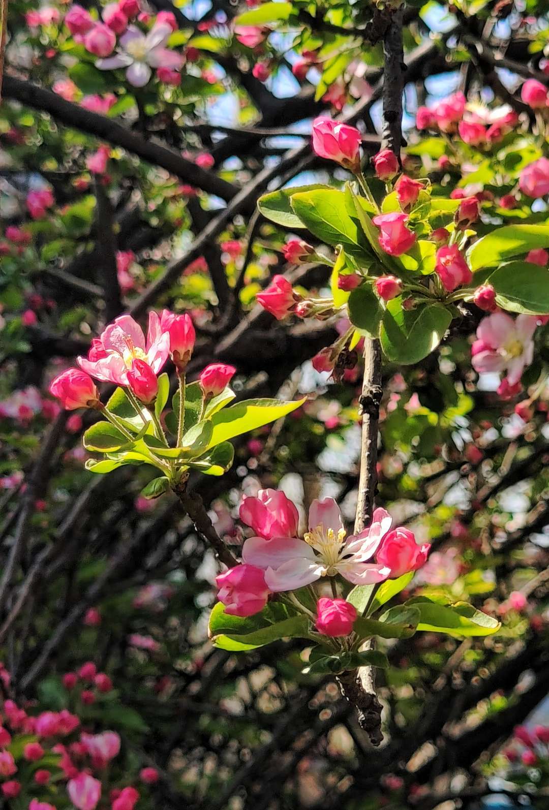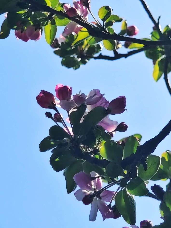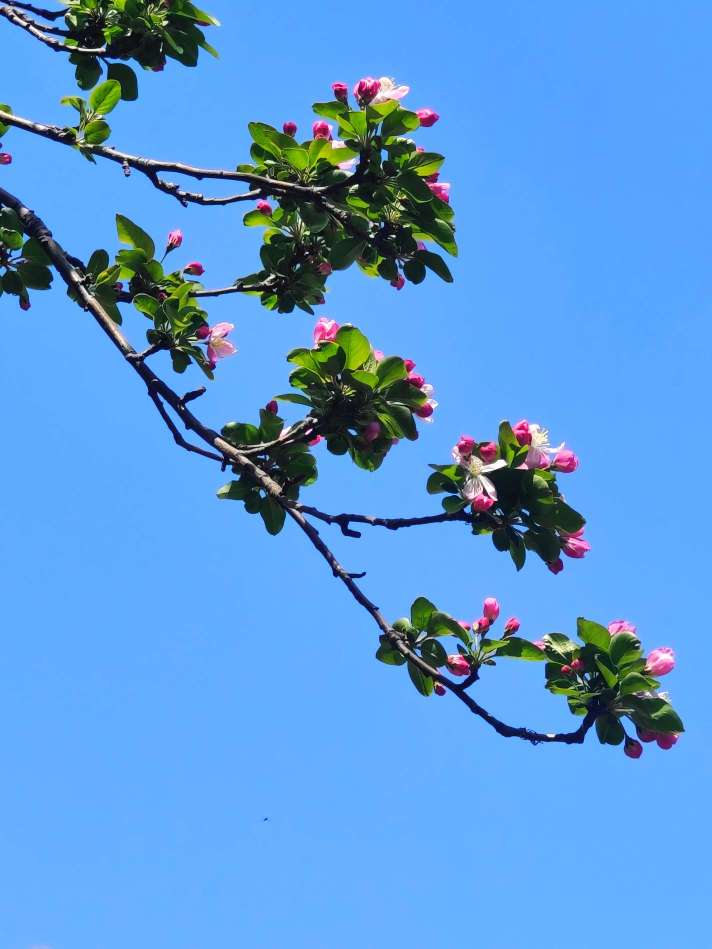春风轻拂,西府海棠摇曳生姿,花瓣轻柔摆动,娇柔婀娜,姿态俏皮,明媚迷人,好似在向人们展现它的曼妙风姿。暖阳下绽放出艳丽的花朵,和嫩绿的叶片相互映照,满树的繁花似锦缎般绚烂,既绘就了一幅生机盎然、五彩斑斓的绝美画卷,又成为春天里一抹亮丽的景致。(高军摄影)