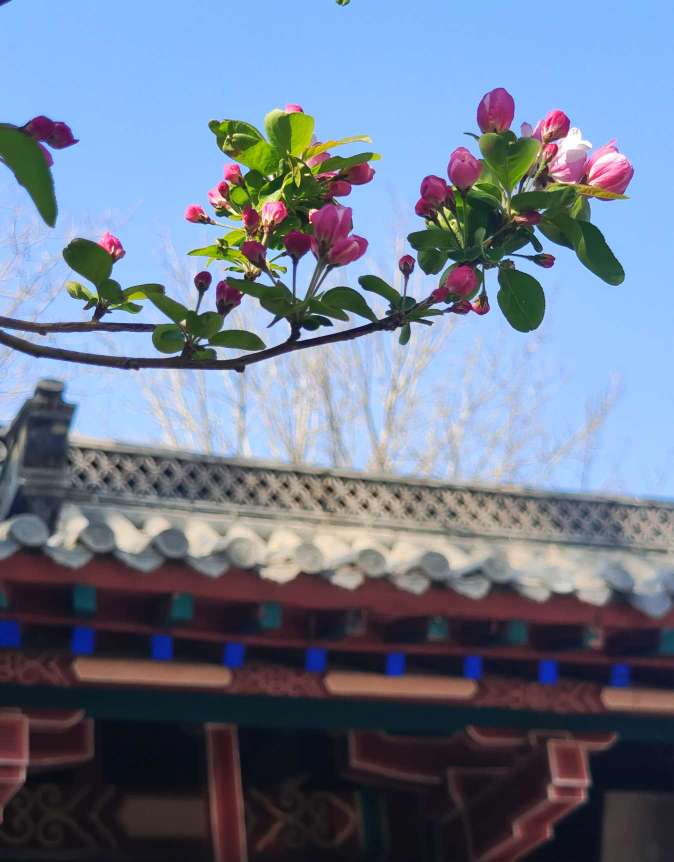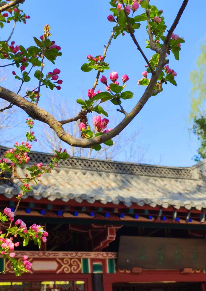 春归大地,满园皆春。济南趵突泉中的西府海棠盛开之时摇曳生姿,暗香盈动,染遍满园春光。看,未绽的花蕾仿若胭脂点点,恰似娇羞的少女,满心期待尽藏心中;花开之际,满树满溢恬静的香玉韵味,渐变的粉红花瓣就像晓天明霞,美不可言。